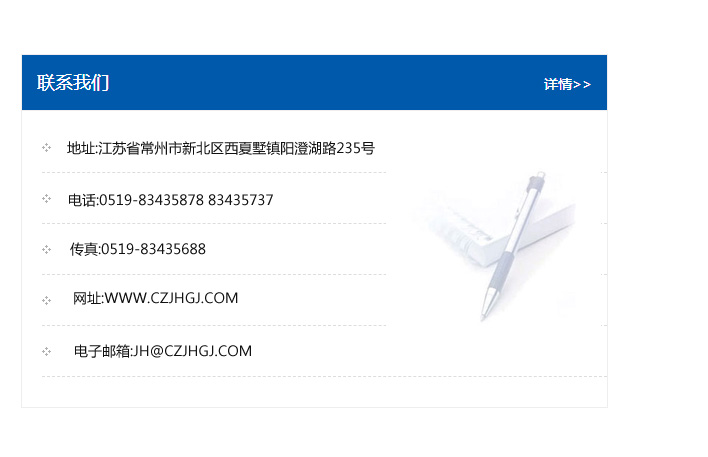 地址:常州市新北區友邦商務大廈1幢16、17層  電話:0519-85101652  傳真:0519-85112595  郵編:213022  網址:www.cz-jiayue_cn.syzpjx.com  郵箱:xiajifengaa@163.com